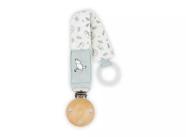 Mummi-smokkeklemmen i blå er et stilig og praktisk tilbehør for babyer. Med en sikker treklips og en myk, slitesterk stoffstropp, holder den smokkene lett tilgjengelig og forhindrer at de mistes eller blir borte. Stroppen har sjarmerende Mummi-illustrasjoner.