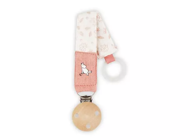 Mummi-smokkeklemmen i rosa er et stilig og praktisk tilbehør for babyer. Med en sikker treklips og en myk, slitesterk stoffstropp, holder den smokkene lett tilgjengelig og forhindrer at de mistes eller blir borte. Stroppen har sjarmerende Mummi-illustrasjoner.